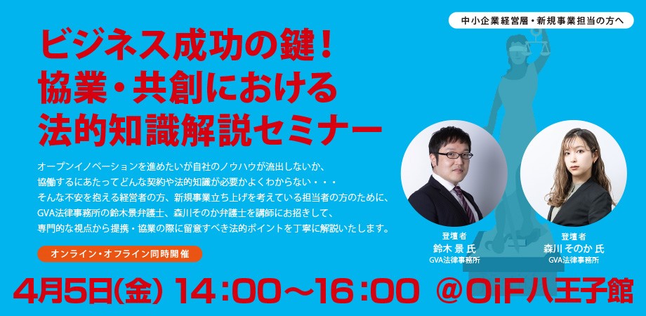 そんな不安を抱える経営者の方、新規事業立ち上げを考えている担当者の方のために、GVA法律事務所の鈴木景弁護士、森川そのか弁護士を講師にお招きして、専門的な視点から提携・協業の際に留意すべき法的ポイントを丁寧に解説いたします。