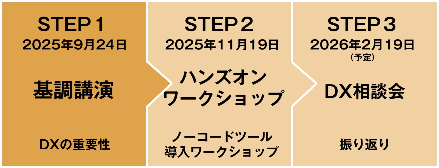 専門知識不要、PCとスマホがあれば始められる無料のノーコードツールとAI活用法を、基調講演・ハンズオンワークショップ・相談会の3回構成で伴走支援。今回は第1回目の基調講演として、中小企業のDX化の重要性と実践事例をお届けします。