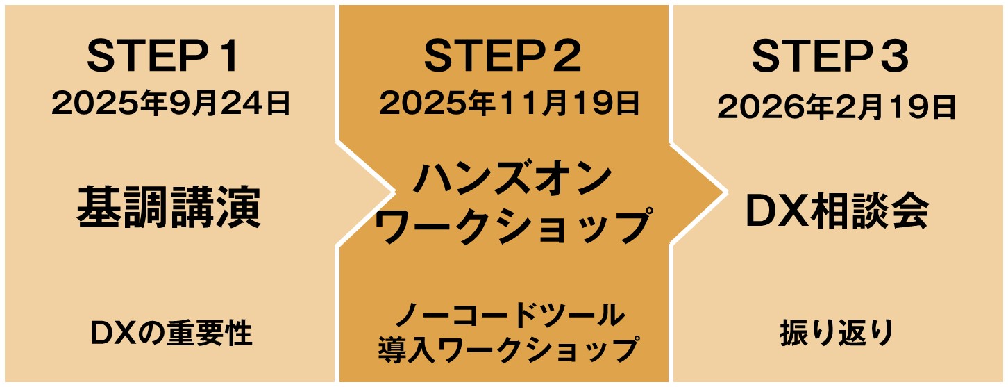 専門知識不要、PCとスマホがあれば始められる無料のノーコードツールとAI活用法を、基調講演・ハンズオンワークショップ・相談会の3回構成で伴走支援。