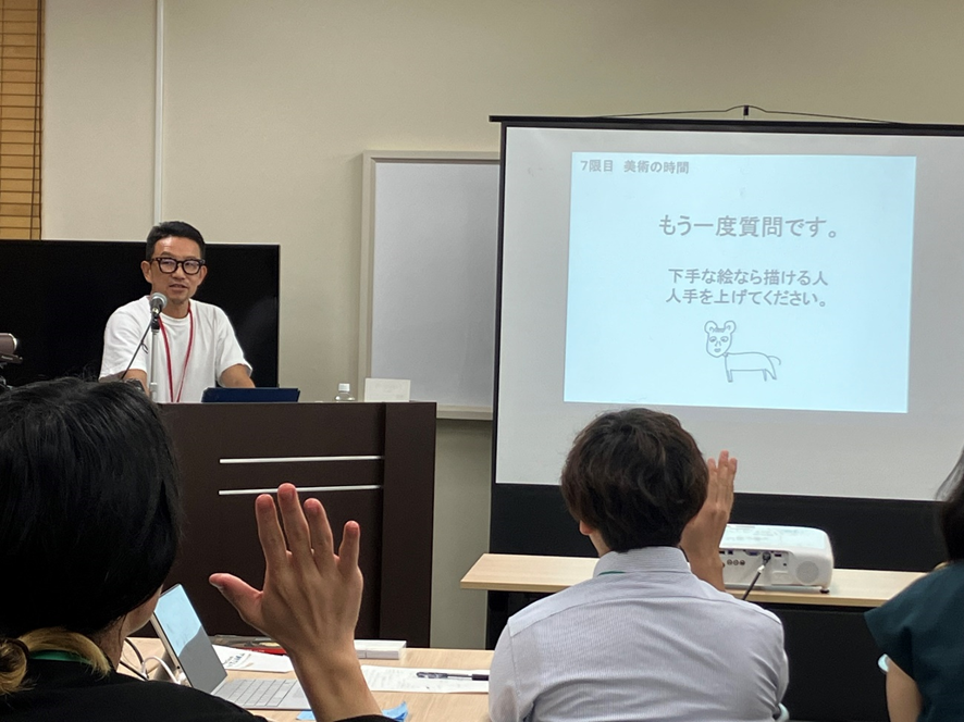 「絵が描ける人、手を上げてください」という質問で、ほぼ挙手がなかった後に続いて、「下手な絵なら書ける人、手を上げてください」と質問をすると下の写真の光景が。