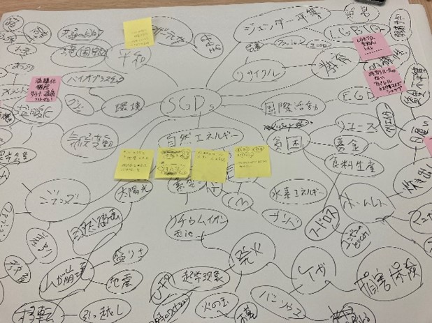 「SDGs」を中心に名詞を入れてマインドマップを広げていき、それぞれ意見を出し合った後、合意形成は多数決ではなく、だまってマップを動かしていき、真ん中のものに決定します。