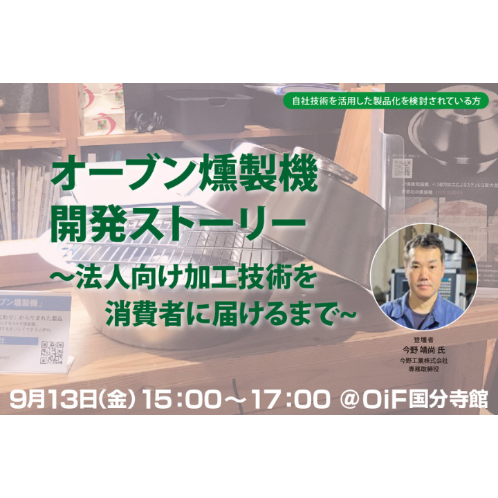 熟練の金属ヘラ絞り加工技術を持つ今野工業㈱の今野靖尚様に登壇いただき、自社の技術を活用したオーブン燻製機で他社との協業によりBtoC市場に進出したキッカケや経緯、商品化の際にこだわったこと、新しい市場に乗り出した時の苦労や収穫などをお話しいただきました。