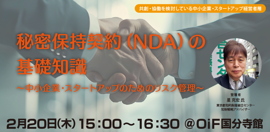 2月20日、オープンイノベーションフィールド多摩 国分寺館で、ものづくりスタートアップ企業・中小企業の経営層の方や他社との共創・協働を検討している方に向けて、専門家より秘密保持契約(NDA)を学んでいただくセミナーを開催いたしました。