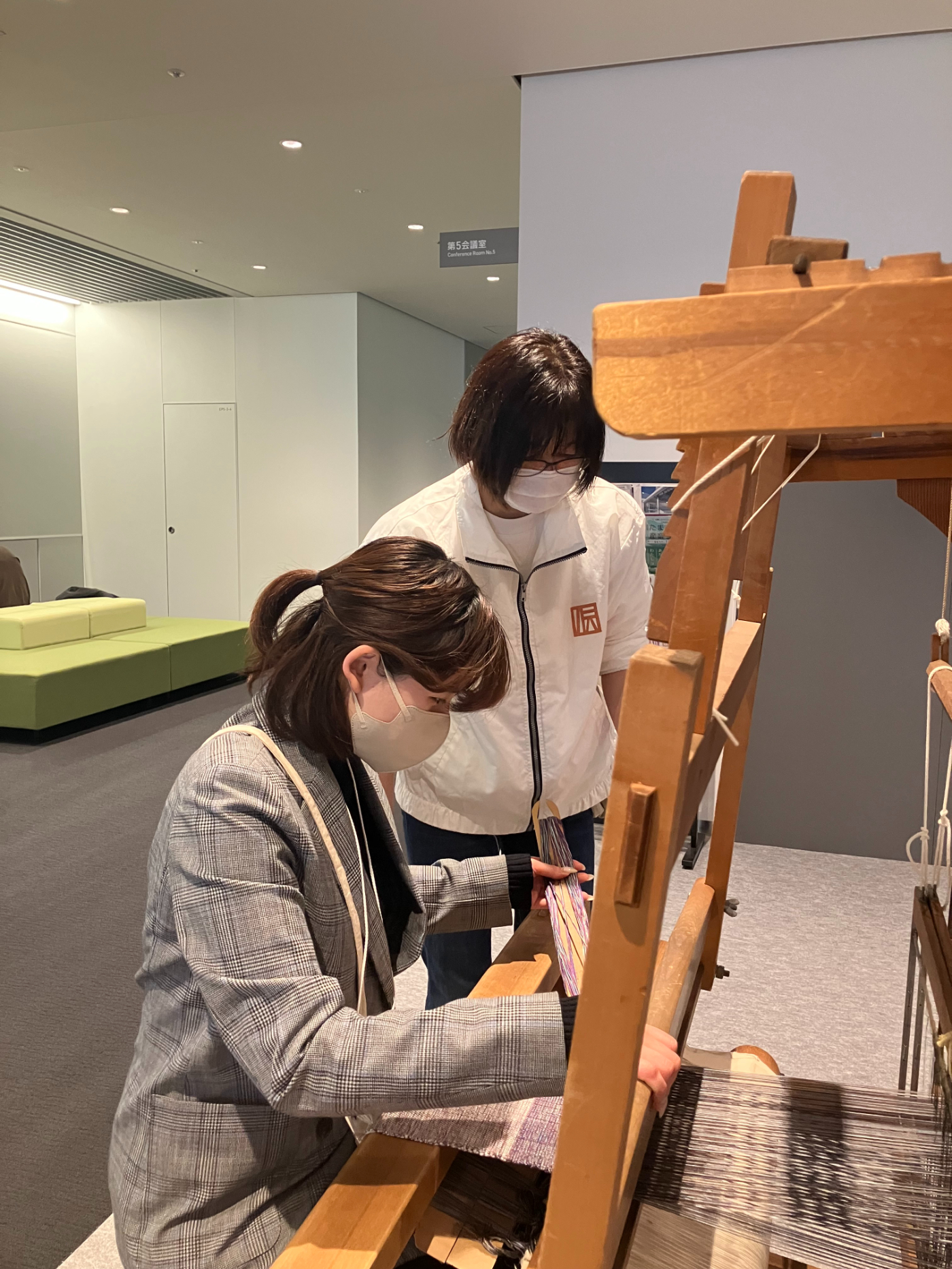 一部のエリアでははがき染め体験やキッズ工作・実験体験などワークショップが実施されていました。スタッフも 3Fエリアにて、手織り体験に参加させていただきました。 伝統工芸品である「多摩織」を伝統工芸士さんに手取り足取り教えていただき、少しずつ織れるようになりました。