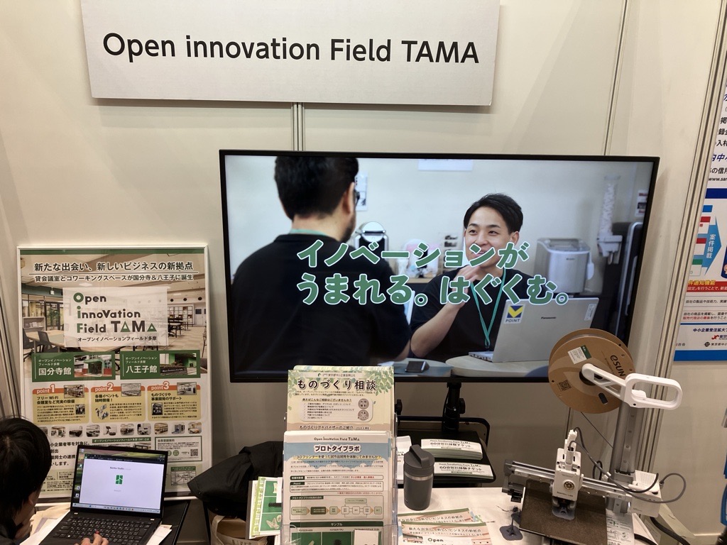 オープンイノベーションフィールド多摩は東京都中小企業振興公社様ブースの一角として、出展させていただきました。 当施設を紹介する動画投影と、3Dプリンターでの実演をし 、立ち止まってくださった方に施設のサービスやプロトタイプラボ、企画を進めている製品技術展示会について お伝えすることができました。 貴重な機会をいただき、ありがとうございました。