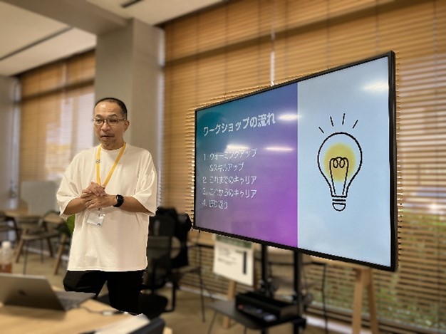 「このワークショップでは、まずレゴブロックを使って現状のキャリアを視覚化します。これは、自分の強みや弱み、現状の課題を具体的に把握するためのステップです。次に、理想のキャリア像をレゴブロックでデザインし、そのために必要なステップを考えます。このプロセスを通じて、皆さんが自分のキャリアについて新たな視点を得ることができるようサポートします。」