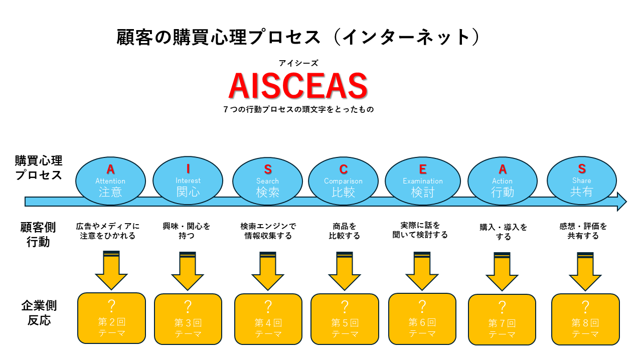 第1回は館名でもある「オープンイノベーション」の実現について、第2回から第8回はインターネット社会での顧客の購買プロセスを説明するモデルの【AISCEAS(アイシーズ)】を土台にして、顧客の行動に企業が採るべき対応としました。(毎回1つずつ)