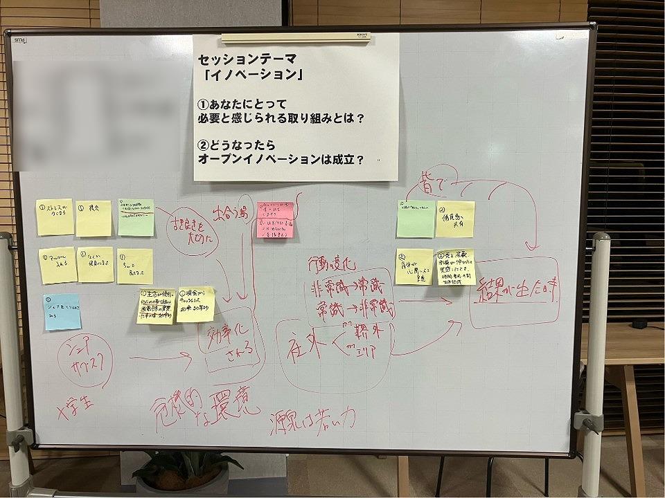 オープンイノベーションを促進するために必要な取り組みを議論しました。出会いの場づくりや「古き良き」を大切にする価値観が、地域の新たな発展に重要とされました。