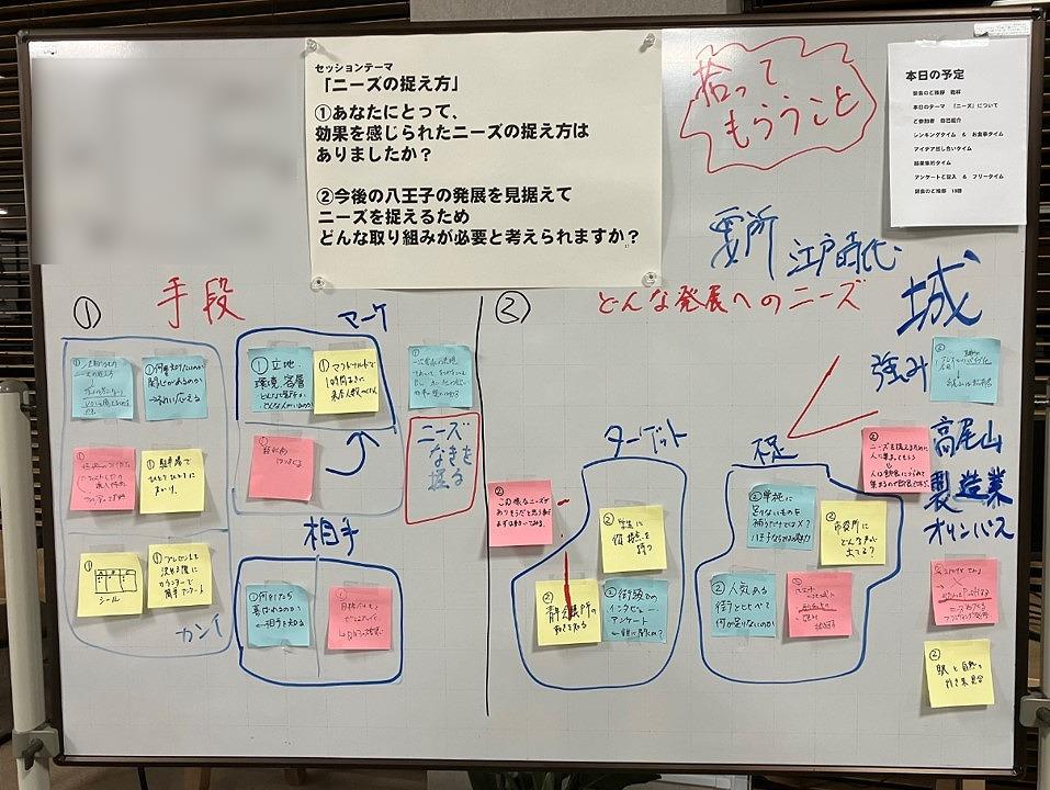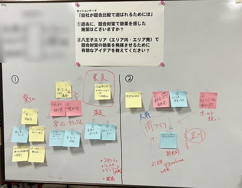 地域特性を活かした差別化戦略について議論し、「街づくり」の意識や八王子の文化や歴史を強みにしたPRが有効とされました。