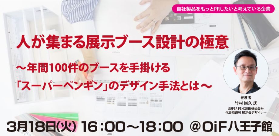 今回はスーパーペンギン株式会社 代表取締役 竹村尚久氏をお招きし、年間100件以上の展示ブースを手掛ける経験をもとに、効果的なブースデザインの秘訣をお話しいただきました。